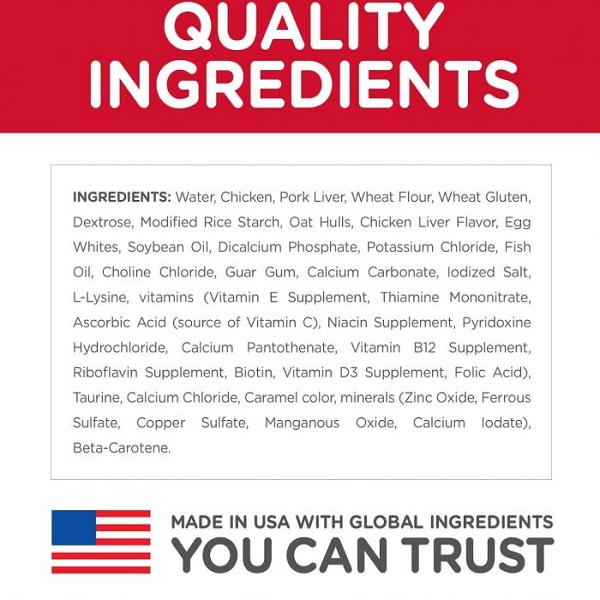 with Chicken (minimum Chicken 20%, Chicken and Turkey combined 30%): Pork liver, pork, chicken, soybean meal, dried whole egg, animal fat, maize gluten meal, maize starch, digest, dried beet pulp, cellulose, dicalcium phosphate, fish meal, fish oil, L-lysine hydrochloride, dried yeast, calcium carbonate, calcium sulphate, DL-methionine, taurine, potassium chloride, L-tryptophan, magnesium oxide, vitamins and trace elements.
