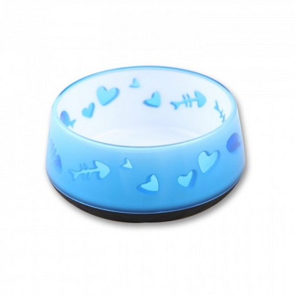 This blue unique cat love bowl is perfect for feeding or providing feline fresh water. It features fish and love cut out alongside the outer edges, providing a small tough of style. With the bright color, the cat will love it.