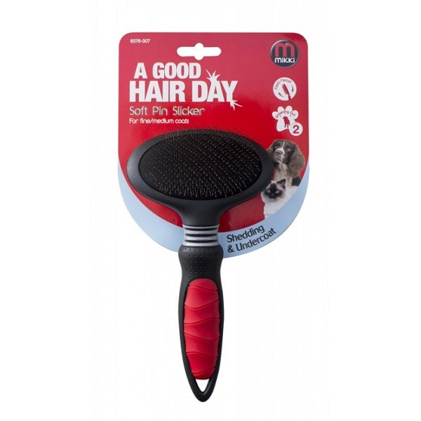 The Mikki Soft Pin Slicker has specially shaped slicker pins which are mounted on an air cushion to enhance grooming action & reduce any excessive brushing force.